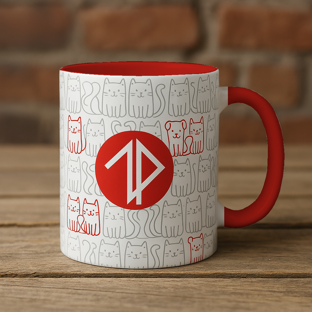 Tazza in ceramica bianca con interno e manico colorati utilizzabile nel microonde e certificata per alimenti confezionata in una scatola con finestra laterale.